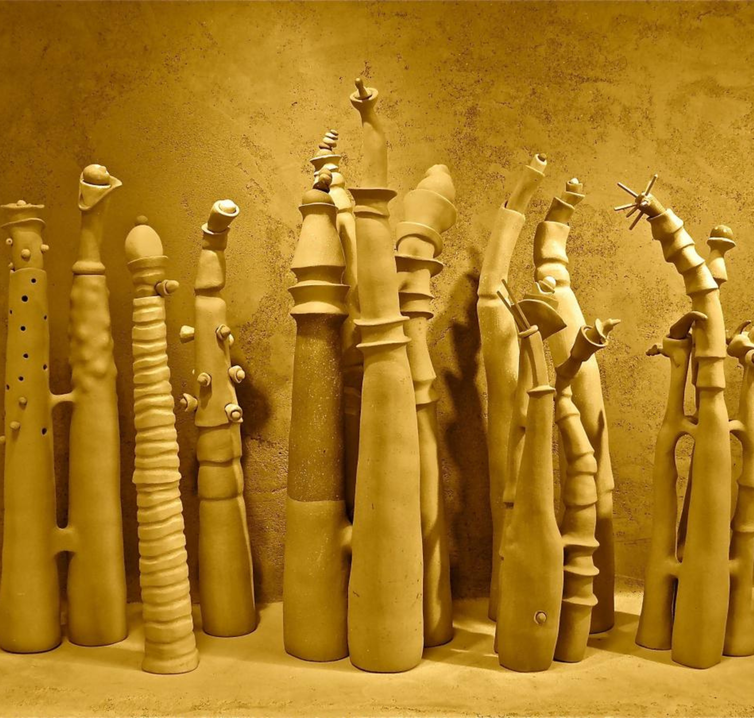 Nora Naranjo Morse, "Moon Orchids," 2016, clay, full installation (dimensions variable) 4 ft x 27 in. Courtesy of the artist